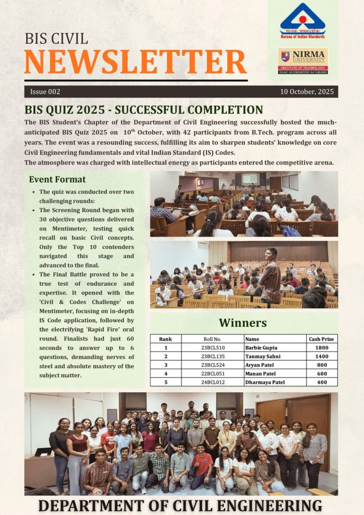We sincerely thank Dr. Parul Patel, Head of the Civil Engineering Department, Nirma University and Dr. Rajesh Patel, Director, SoE, Institute of Technology, Nirma University, for their constant support and encouragement. Our heartfelt gratitude also goes to BIS Ahmedabad for their collaboration and guidance in organizing this event.