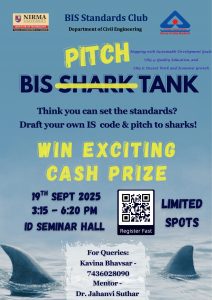 The BIS Student’s Chapter – Department of Civil Engineering, Nirma University Standard Chapter – Civil Engineering successfully organized the event “BIS Pitch Tank” on 19th September 2025 at the ID Seminar Hall, Nirma University.