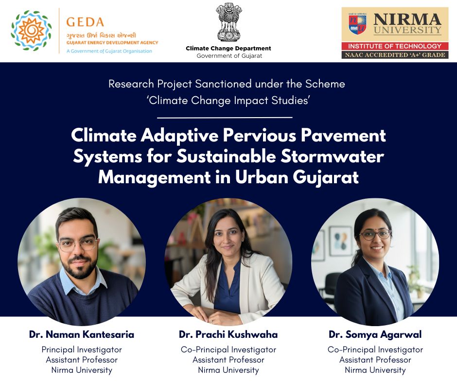 We are pleased to announce that the research project titled “Climate Adaptive Pervious Pavement Systems for Sustainable Stormwater Management in Urban Gujarat” has been approved and sanctioned by the Climate Change Department, Government of Gujarat.